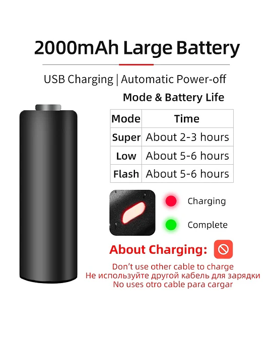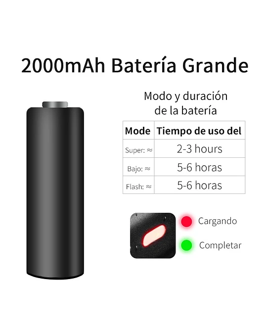 Este modelo es de alta calidad ideal para tus salidas nocturnas en el campo o para moverte en la ciudad. Te sentirás mucho más seguro ya que serás visible desde la lejanía. Con su carga usb podrás recargar cada vez que tú lo necesites desde el cargador de tu celular o tu computador.